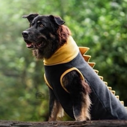 Da dieses Produkt als Auftrag angefertigt wird, kannst du dir deinen Dino individuell zusammen stellen, zwischen schmalen Kragenbündchen und Kragen wählen. Basis schwarz mit ‚bunten‘ Spikes, Bündchen und Kragen.